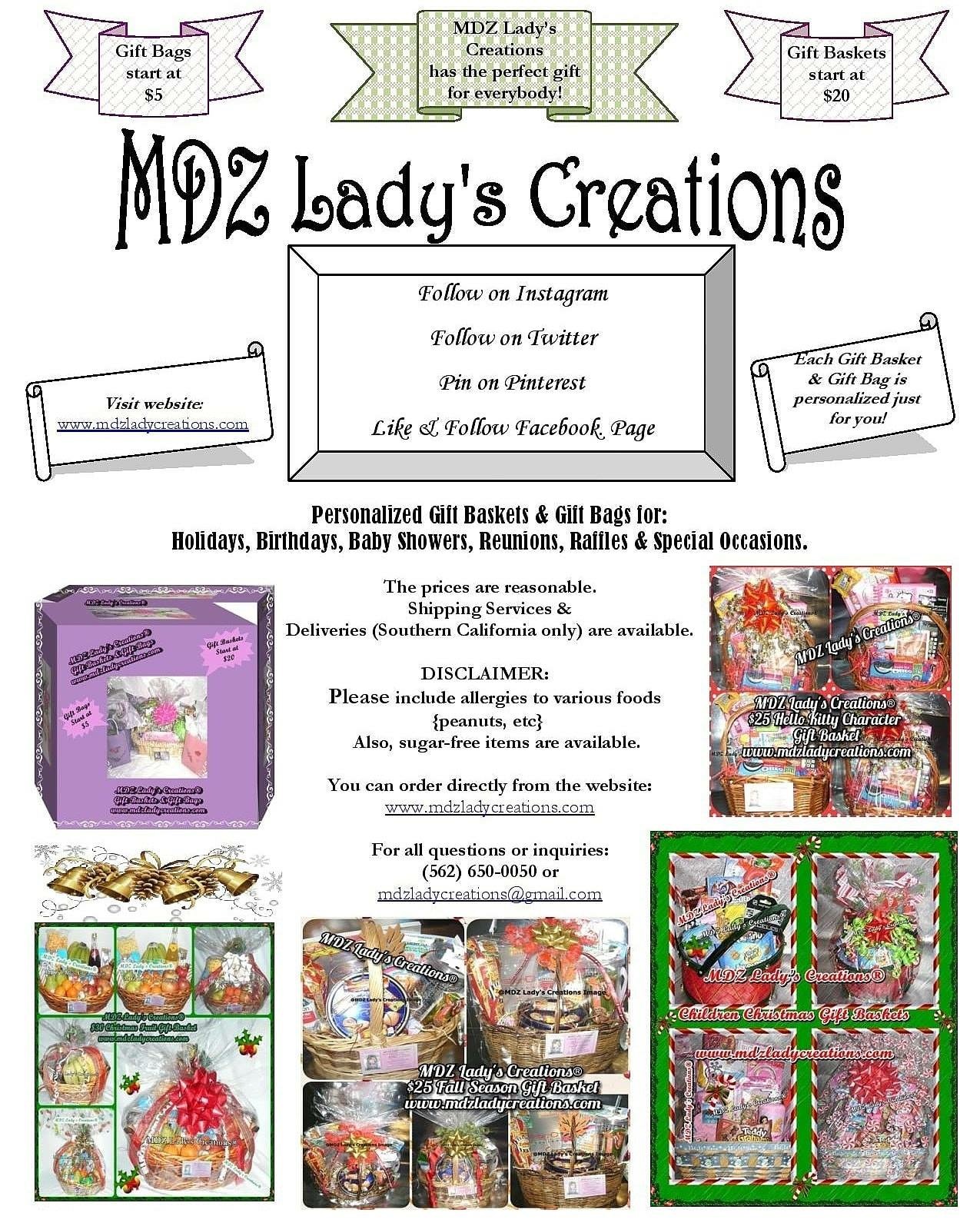 MDZ Lady's Creations® has been in the making over 30 years by creating gift baskets and gift bags for churches, families & friends at the very low cost of free!!!